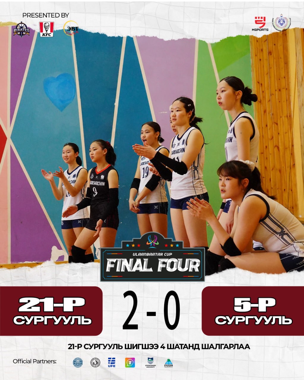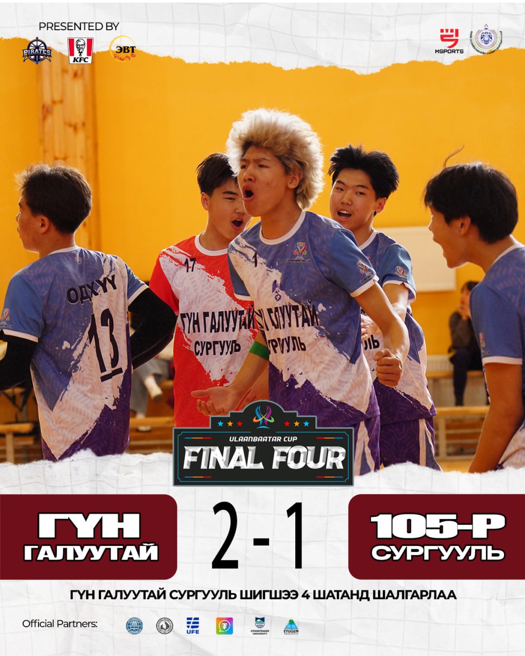 Зүүн бүсийн аварга, Багануур, Багахангай дивизоны аварга Гүн Галуутай сургууль болон Сонгинохайрхан дивизоны аварга 105-р сургуулийн багууд тоглож, гайхалтай гурван ээлжийн тоглолтод “16:25, 25:23, 15:9” харьцаатайгаар Гүн Галуутай сургууль ялалт байгуулж, тэмцээний Final Four-д шалгарлаа. Тус тоглолтод Гүн Галуутай сургуулийн багаас багийн өндрийн довтлогч #1 Э.Азжаргал довтолгоогоор 9 оноо, хаалтаар 1 оноо авч, гайхалтай тоглолтыг үзүүлж багаа оноо авалтаар тэргүүллээ.