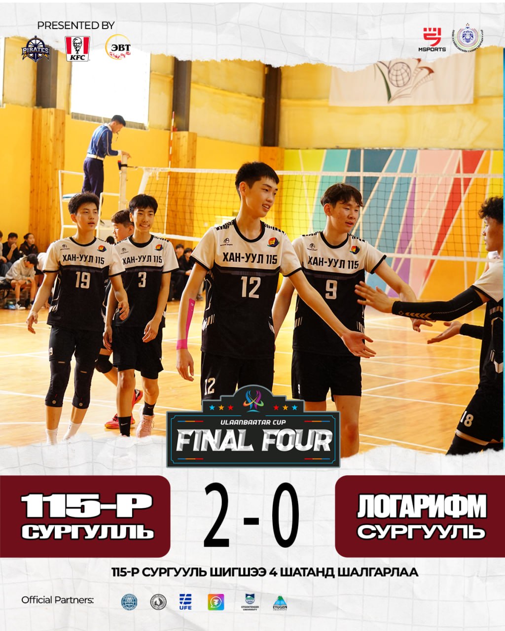 Улаанбаатар Кап тэмцээний волейболын төрлийн эрэгтэйчүүдийн ахлах насны шигшээ наймын тоглолтууд мөн явагдсан бөгөөд Урд бүсийн аварга, Хан-Уул дивизоны аварга 115-р сургууль болон Сүхбаатар дивизоны аварга Логарифм сургуулийн багууд тоглож, хоёр ээлжийн тоглолтод “25:9, 25:13” харьцаатай 115-р сургууль ялалт байгуулж, тэмцээний Final Four-д шалгарлаа. Тус тоглолтод 115-р сургуулийн багийн ахлагч, багийн өндрийн довтлогч #8 Б.Тэлмэн довтолгоогоор 8 оноо, давуулалтаар 2 оноо авч, гайхалтай тоглолтыг үзүүлж багаа оноо авалтаар тэргүүллээ. Урд бүсийн аварга, Хан-Уул дивизоны аварга 115-р сургуулийн баг тэмцээний Final Four-д Зүүн бүсийн аварга, Багануур, Багахангай дивизоны аварга Гүн Галуутай сургуулийн багтай тоглохоор боллоо.