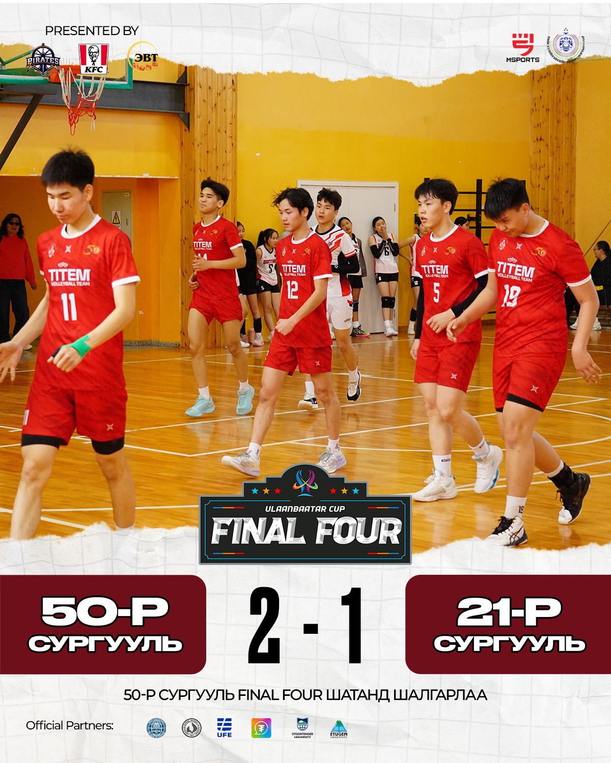 Хойд бүсийн аварга, Чингэлтэй дивизоны аварга 50-р сургууль болон Баянзүрх дивизоны аварга 21-р сургуулийн багууд тоглож, гурван ээлжийн гайхалтай тоглолтод “22:25, 26:24, 15:12” харьцаатайгаар 50-р сургууль ялалт байгуулж, тэмцээний Final Four-д шалгарлаа. Тус тоглолтод 50-р сургуулийн багаас багийн өндрийн довтлогч #14 Н.Дөлбаяр довтолгоогоор 25 оноо, хаалтаар 1 оноо авч, гайхалтай тоглолтыг үзүүлж багаа оноо авалтаар тэргүүллээ. Хойд бүсийн аварга, Чингэлтэй дивизоны аварга 50-р сургуулийн баг тэмцээний Final Four-д Баруун бүсийн аварга, Баянгол дивизоны аварга 141-р сургуулийн багтай тоглохоор боллоо.