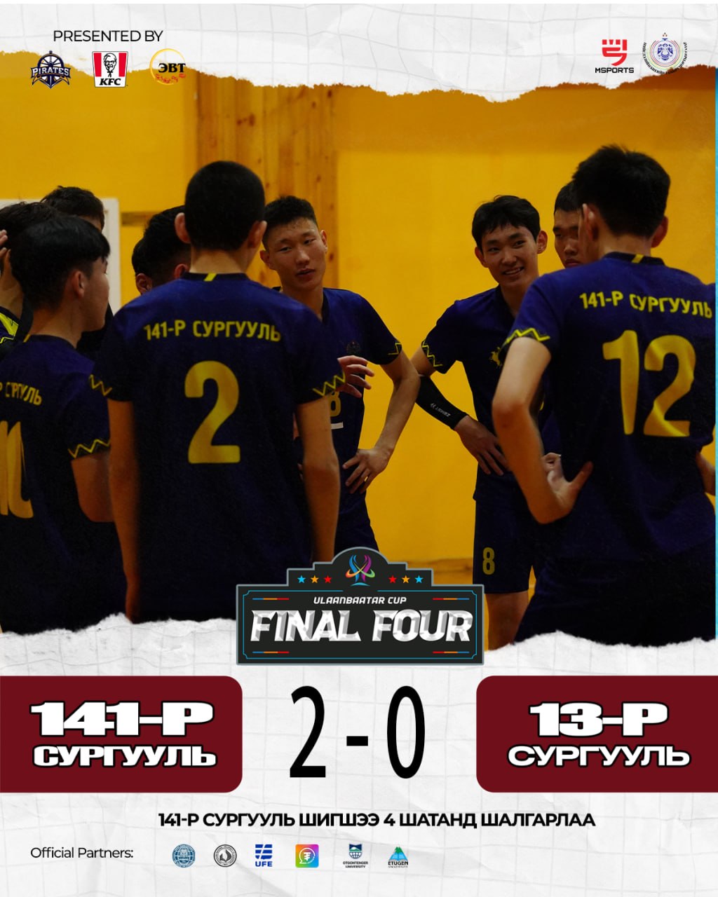 Баруун бүсийн аварга, Баянгол дивизоны аварга 141-р сургууль болон Баянгол дивизоны нэмэлт эрхээр шалгарсан 13-р сургуулийн багууд тоглож, хоёр ээлжийн тоглолтод “25:19, 25:21” харьцаатайгаар 141-р сургууль ялалт байгуулж, тэмцээний Final Four-д шалгарлаа. Тус тоглолтод 141-р сургуулийн багаас багийн өндрийн довтлогч #7 Б.Сайнбаяр довтолгоогоор 8 оноо, давуулалтаар 1 оноо авч, гайхалтай тоглолтыг үзүүлж багаа оноо авалтаар тэргүүллээ.